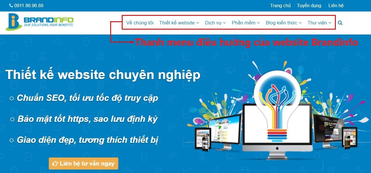 Ví dụ như trong trang website của Brandinfo, thanh Menu điều hướng sẽ hiển thị những đầu mục tổng quan về thông tin mà trang web có thể cung cấp đến bạn. Tùy thuộc vào nhu cầu tìm kiếm thông tin của mình, bạn hoàn toàn có thể chọn đầu mục phù hợp và tiếp tục tìm những thông tin mang tính chi tiết và cụ thể hơn như Thiết kế website, Phần mềm hay Blog kiến thức...