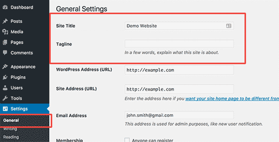 Bạn có thể thay đổi cả tiêu đề và dòng giới thiệu của trang web của mình bất kỳ lúc nào bằng cách truy cập Settings » trang General.